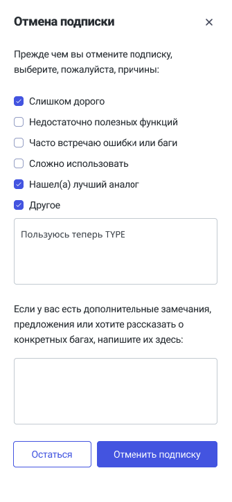 При нажатии пользователя на кнопку "Отменить подписку" отобразится модальное окно с причинами отписки.