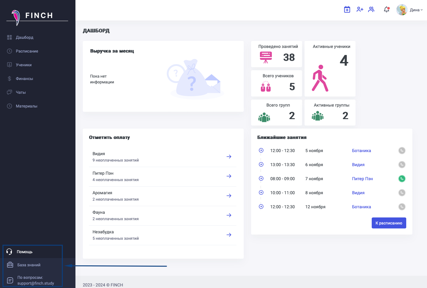 В системе всегда доступен переход к разделу "Помощь" в левом нижнем углу. Там содержится база знаний по Finch, а также информация о связи с поддержкой.