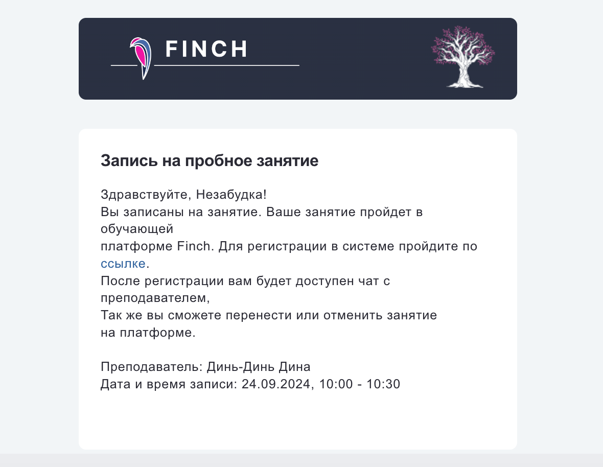 После отправки заявки на пробное занятие клиент получит письмо, где его попросят зарегистрироваться в Finch самостоятельно.